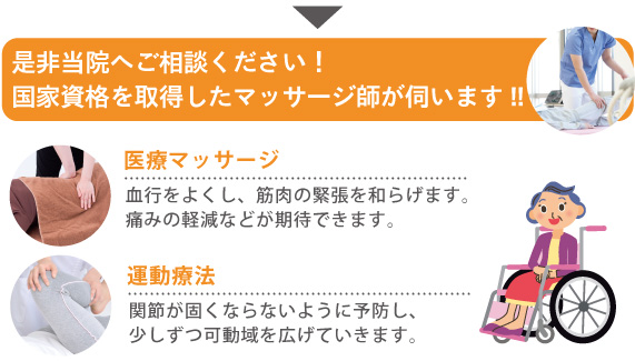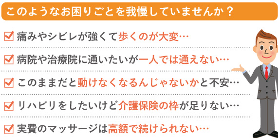 UNO訪問治療院のマッサージでは、各種介護サービスをご利用の方でも併用が可能です。 だから、介護保険の枠は心配不要です。