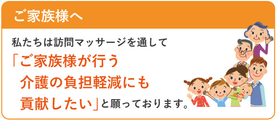 同意書を頂いた医療機関、ケアマネージャー様、ご家族様に定期的にご報告し、皆様のご意見や様々な情報をいただきながら、ご利用者様にとって最善のマッサージ施術を行ってまいります。どうぞご安心してお任せください。