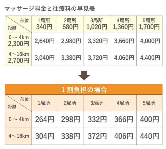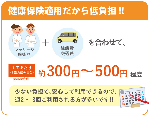 この場合、「UNO訪問治療院」にお支払いいただく施術料金は、原則として一般的な病院等の医療機関と同様に自己負担額(1割〜3割)のみとなります。
