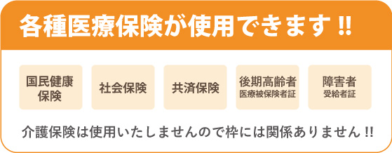 75歳以上の方は後期高齢者受給者証(1割負担)、75歳未満の方は国民健康保険(3割負担)や組合保険など、お手持ちの健康保険がお使いになれます。
