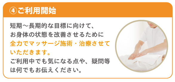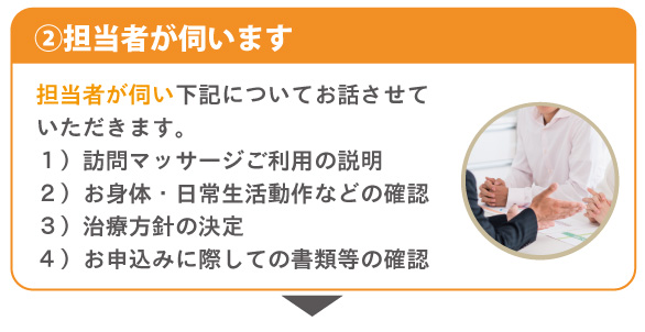 国家資格である「あん摩マッサージ指圧師」の有資格者が、同意書をもとに、ご利用者様のお身体の状態と目的に合わせたマッサージ施術を行います。